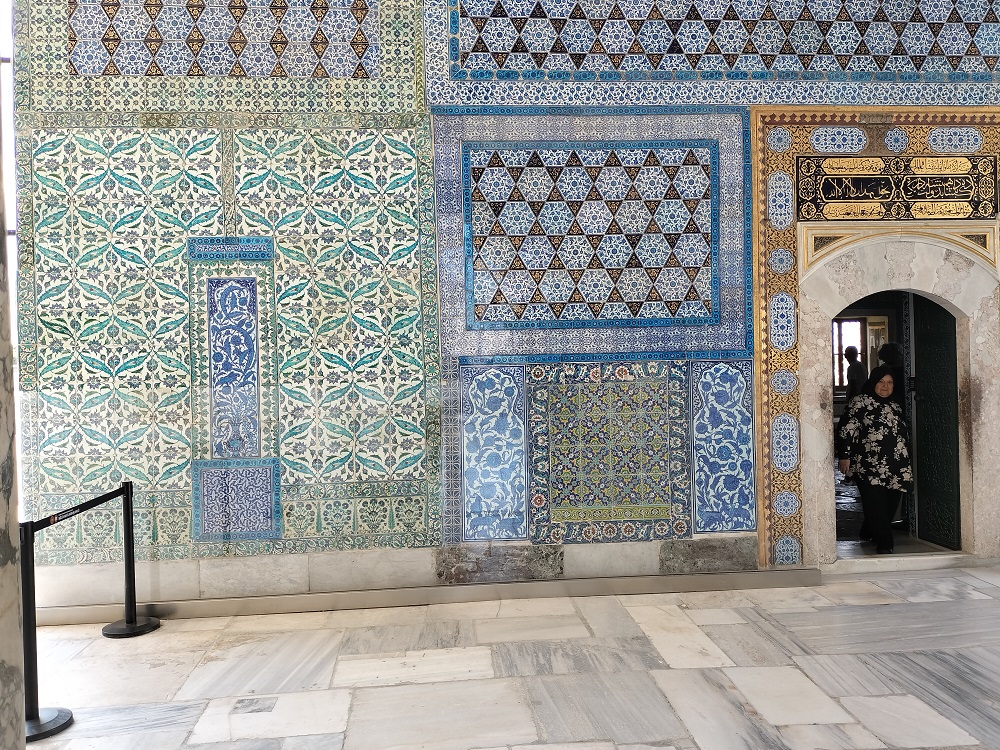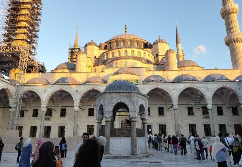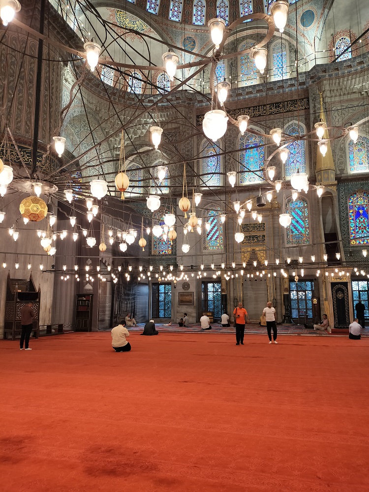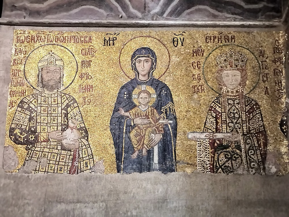 はじめてモスクの建物に行く。ブルーモスク、世界で一番美しいモスクと言われているのだそうだ。お祈りの時間の合間に建物の中に入る。絨毯の上にぺたんと座る。すぐにお祈りの時間になり建物を出る。近くにアヤソフィア大聖堂があり、王宮につながっている。イスタンブール歴史地域の歴史的建造物群として世界遺産になっている。アヤソフィア大聖堂と王宮に入るにはなかなかの行列に並ばないといけない。 アヤソフィア大聖堂はビザンティン帝国の時代にキリスト正教会の大聖堂として造られ、オスマン帝国になりイスラム教のモスクとして改築が繰り返されている。ビザンティンのモザイクが残されている。モスクの中でキリストを見る。